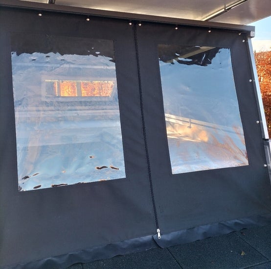 - Entrée de la cabine avec toile de tente ; avec 2 grandes fenêtres